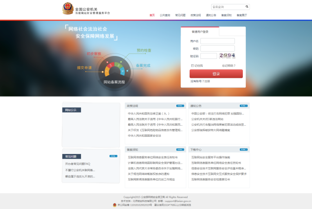 三、提交備案以后等待公安分局網(wǎng)安大隊(duì)進(jìn)行審核,對(duì)于非交互式網(wǎng)站,分局網(wǎng)安大隊(duì)審核后可直接發(fā)放備案編號(hào);對(duì)于交互式網(wǎng)站,分局網(wǎng)安大隊(duì)進(jìn)行網(wǎng)上核驗(yàn)后將通過電話或短信通知網(wǎng)站主預(yù)約時(shí)間進(jìn)行當(dāng)面核驗(yàn)和實(shí)地檢查,完成備案手續(xù)。網(wǎng)站備案審核通過以后,網(wǎng)站主登錄全國(guó)公安機(jī)關(guān)互聯(lián)網(wǎng)站安全服務(wù)管理平臺(tái)取得公安機(jī)關(guān)備案編號(hào),并將備案編號(hào)放置于網(wǎng)站首頁(yè)最下方,此時(shí)方視為履行完整個(gè)備案手續(xù)。如下圖