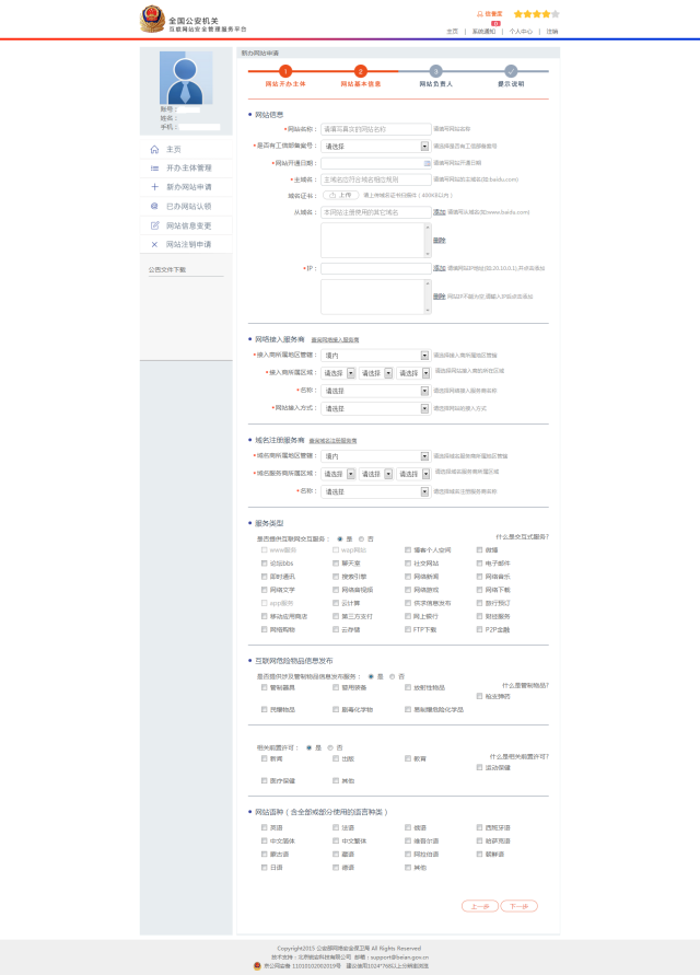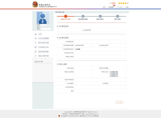 二、登錄系統(tǒng)以后,按步驟填寫網(wǎng)站主辦單位信息、負(fù)責(zé)人信息及網(wǎng)站信息,進(jìn)行提交
