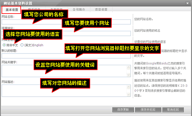 基本設(shè)置主要是填寫網(wǎng)站名稱連接地址、網(wǎng)站主語(yǔ)言默認(rèn)的標(biāo)題網(wǎng)站關(guān)鍵字、網(wǎng)站描述,填寫完后記得點(diǎn)擊“保存更新”。