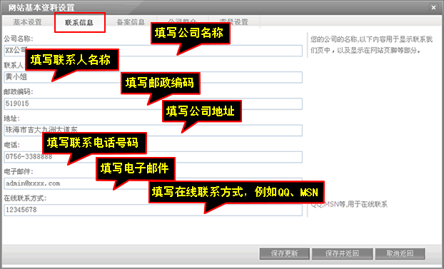 聯(lián)系信息主要填寫公司名稱、聯(lián)系人、郵政編碼地址電話電子郵件線聯(lián)系方式,填寫完后記得點(diǎn)擊保存更新。