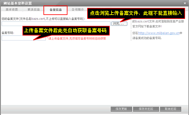 這里主要是上傳備案文件(備案文件要登陸到www.miibeian.gov.cn去下載),備案號(hào)碼在上傳好備案文件后自動(dòng)獲取,無(wú)需填寫,填寫完后記得點(diǎn)擊“保存更新”。