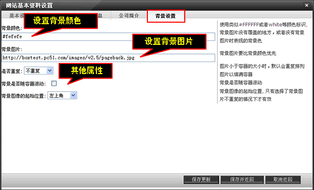 背景圖片:直接輸入背景地址就可以顯示出背景圖片:例如輸入http://boxtest.pc51.com/images/v2.5/pageback.jpg ,可以設(shè)置圖片是否重復(fù)、滾動(dòng)以及起始位置。