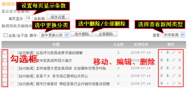 這里主要設(shè)置每頁(yè)“顯示多少條新聞”,新聞列表及編輯內(nèi)容里面可以選中更換新聞的類別、“選中刪除”、“全部刪除”,可以按類型查看新聞。新聞操作還可以對(duì)新聞進(jìn)行位置移動(dòng)、編輯、刪除。