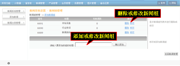 新聞分類管理主要對(duì)已有的新聞組進(jìn)行刪除修改,添加新聞組,輸入后點(diǎn)擊“確認(rèn)添加”。