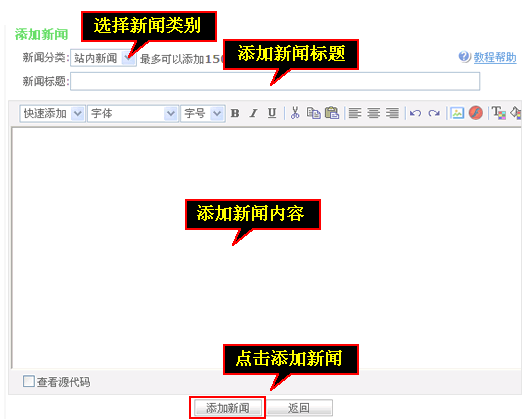 添加新聞時(shí)要選擇“新聞分類”、“填寫新聞標(biāo)題”、添加“新聞內(nèi)容”,填寫完后點(diǎn)擊“添加新聞”完成添加。