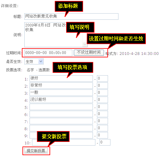 點(diǎn)擊“增加投票項(xiàng)目”,彈出詳細(xì)設(shè)置,需要填寫(xiě)標(biāo)題、說(shuō)明、設(shè)置過(guò)期時(shí)間、是否生效,還有填寫(xiě)投票選項(xiàng),名字選票數(shù),最后點(diǎn)擊“提交新投票”。
