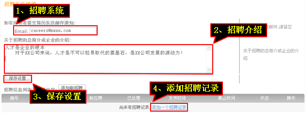 3、輸入“郵箱”、“招聘介紹”,點(diǎn)擊“保存設(shè)置”,點(diǎn)擊“添加招聘記錄