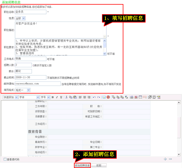 4、填寫“招聘信息”后點(diǎn)擊“添加招聘信息