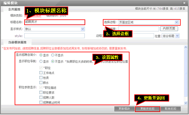 7、輸入模塊標(biāo)題”設(shè)置“相關(guān)屬性”后點(diǎn)擊“更新并返回