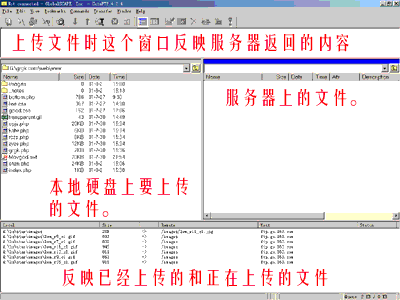 | 3.點(diǎn)擊connect鍵后,就開始連接服務(wù)器了,連接上了后,會(huì)彈出來一對話框,點(diǎn)擊確定后就可以上傳文件了上傳文件時(shí)的操作界面如下圖,中間兩欄左側(cè)為本地硬盤上的文件及文件夾,可以通過其上方的地址框來選擇要上傳文件所在位置,右側(cè)為服務(wù)器上的文件及文件夾,您上傳的信息均應(yīng)存放在www目錄下(只需直接雙擊WWW目錄即可進(jìn)入該目錄),上傳文件時(shí)只需在左側(cè)選中文件再用鼠標(biāo)拖到右側(cè)即可。 |