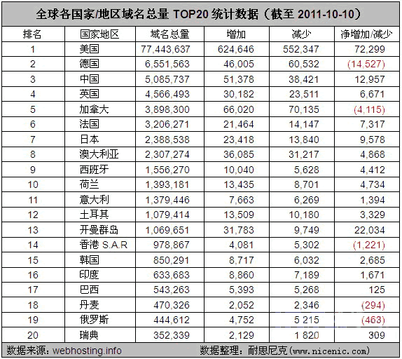 圖:全球各國家/地區(qū)域名總量TOP20統(tǒng)計數(shù)據(jù)(截至2011-10-10)